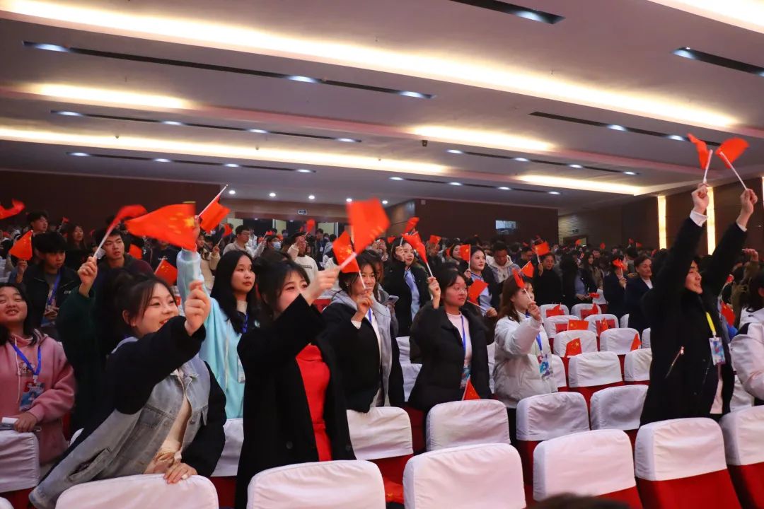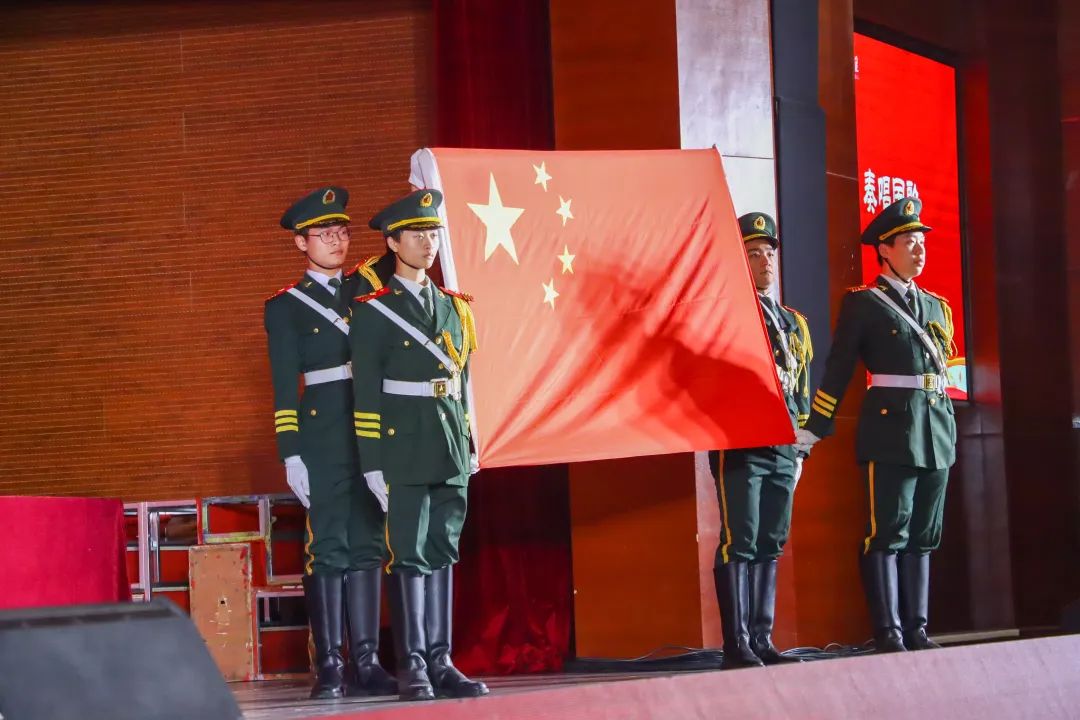 2023年奖学金表彰典礼现场,国旗护卫队目光坚定,迈着整齐的步伐进入会场,全体肃立,奏唱国歌,活动在庄严的国歌声中拉开帷幕。