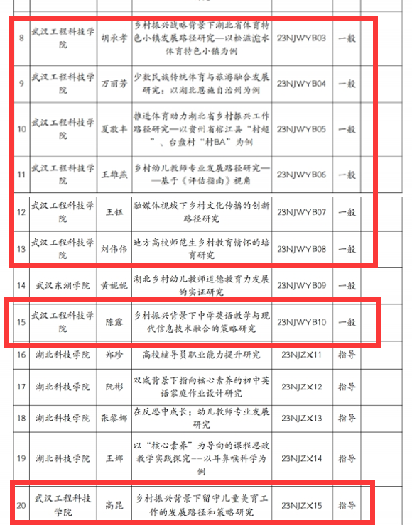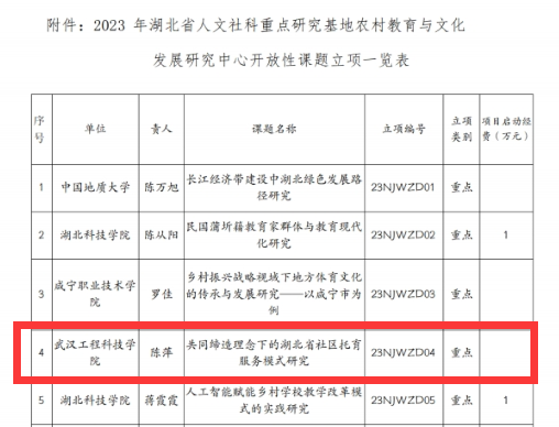 本网讯(通讯员 郭生鼎 赵海燕)近日,湖北省人文社科重点研究基地农村教育与文化发展研究中心2023年度研究项目文件公布,武汉工程科技学院人文学院取得喜人成绩,陈萍等9名教师作为项目负责人成功获批基地项目9项,其中,获批重点项目1项、一般项目7项、指导性项目1项。
