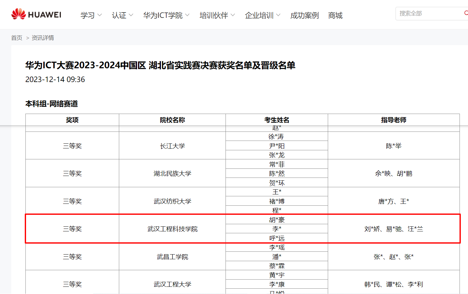 本网讯(通讯员 刘小娇 易文驰)近日,从华为ICT大赛2023-2024中国区实践赛湖北省决赛传来好消息,我校参赛选手在该项赛事获得突破,分别在网络赛道、云赛道和计算赛道上荣获了省级三等奖的好成绩。
