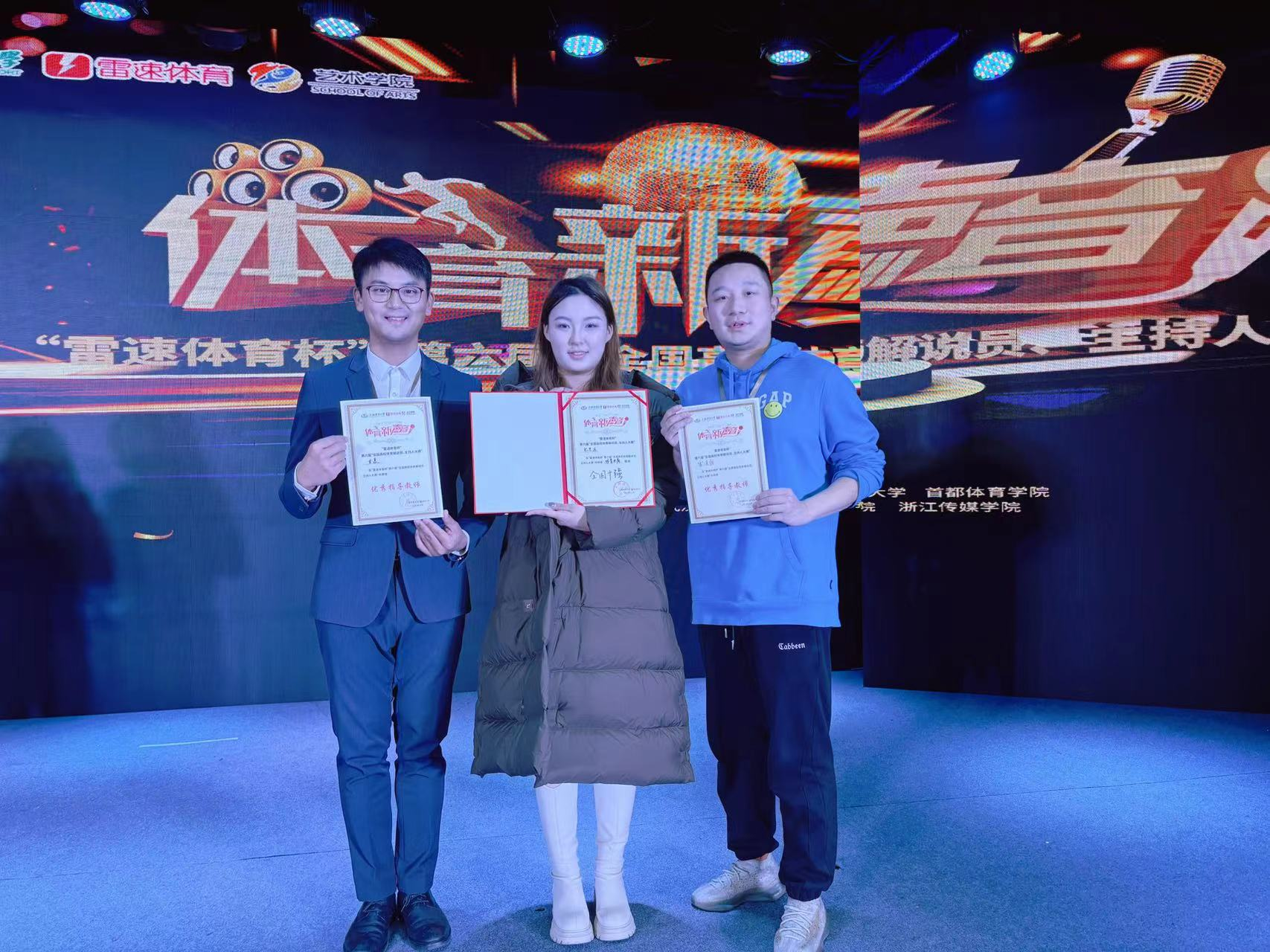 本网讯(通讯员 甘泉 雷淇源)12月23日-24日,第六届“全国高校体育解说员、主持人大赛”在上海体育大学圆满落下帷幕。我校艺术与传媒学院21级播音与主持艺术专业包思远同学获得体育电商赛道“全国十强”,雷淇源、甘泉两位老师获得优秀指导教师奖。