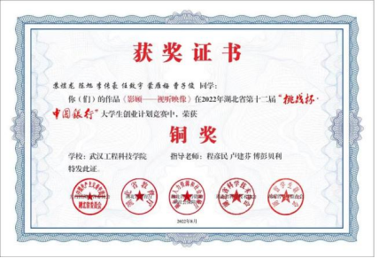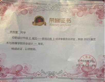在校期间,李传豪综合成绩排名专业第三,荣获多项比赛荣誉及奖学金。此外,李传豪积极组织和参加各类活动,并荣获多项比赛荣誉。2020年9月,他荣获“qq音乐校园大使”,2021年6月荣获“第七届中国国际互联网+大学生创新创业大赛”校级银奖,2021年7月荣获“第13届全国大学生广告艺术大赛”优秀奖,2022年6月荣获湖北省第十二届“挑战杯·中国银行”大学生创新创业计划竞赛省级铜奖,2023年5月荣获2023届艺术与传媒学院毕业设计一等奖。“通过这些活动,我结识了许多志同道合的朋友,也收获了宝贵的经验。在比赛中,我与队友们一起策划、设计,这不仅锻炼了我的创意和设计能力,还收获了团队合作的经验。”李传豪说。