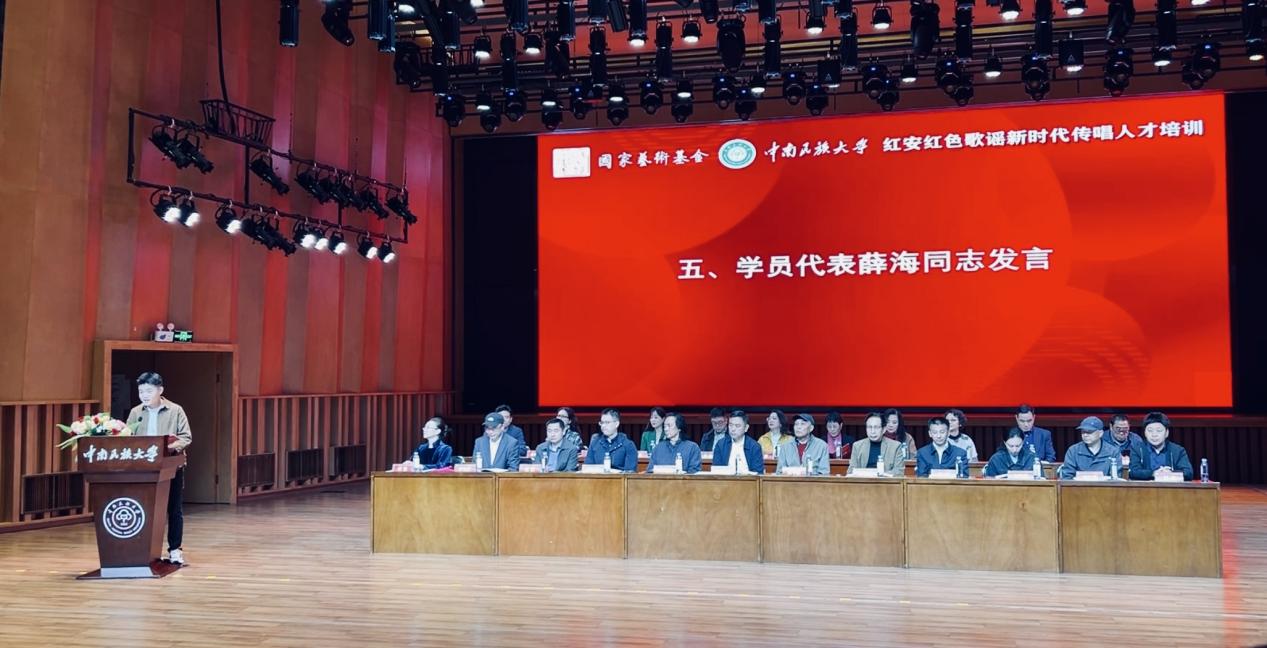 武汉工程科技学院表演系教师薛海入选此次培训,并在开班仪式上作为学员代表发言。在长达 30 天的培训中,接受了系统且丰富的理论与实践大师课,深入探究红安红色歌谣的深厚底蕴与艺术魅力,全方位提升了对红色歌谣的传唱能力。