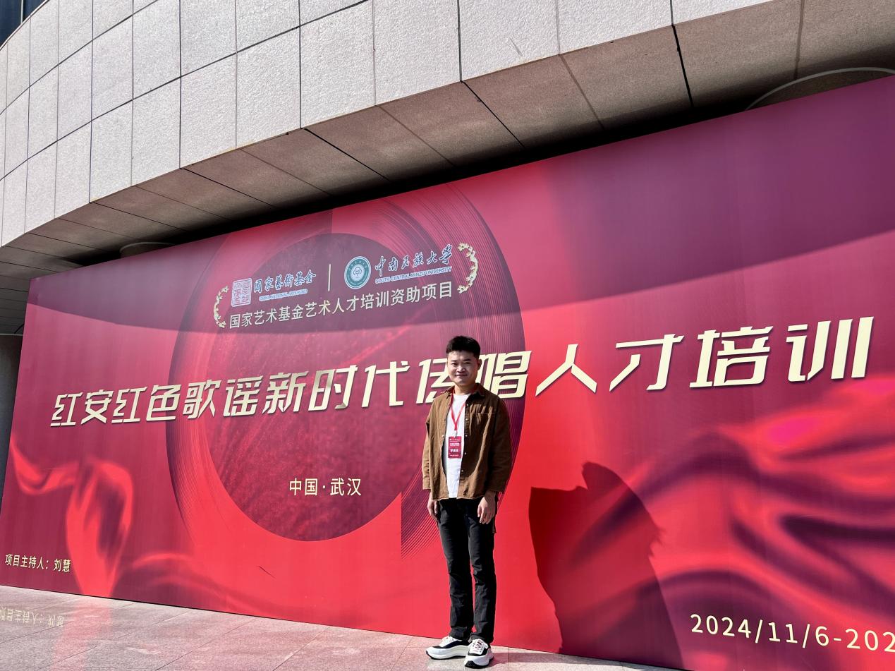 12 月 5 日,结项音乐会盛大举行并取得圆满成功。作为优秀学员的薛海在音乐会上表现卓越,精彩演绎了《放脚歌》《红安红》《红韵中国梦》三首极具代表性的作品。他用真挚的情感与专业的表演,生动展现了红安红色歌谣在新时代的新活力,赢得了台下观众的阵阵喝彩与高度认可。湖北卫视对此次培训进行了直播报道,使得更多观众能够领略红安红色歌谣的独特风采,极大地提升学校的知名度与影响力。