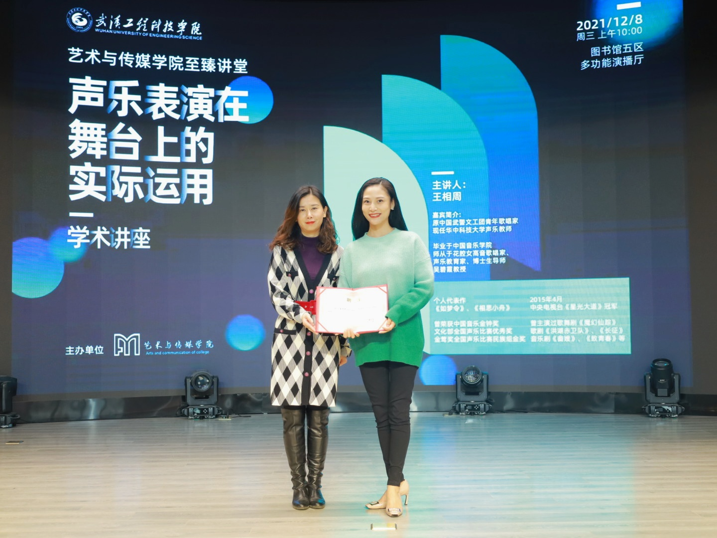 12月8日,原中国武警文工团青年歌唱家、华中科技大学声乐教师王相周受邀来到武汉工程科技学院艺术与传媒学院至臻讲堂,她首先与艺术与传媒学院表演专业教师进行了学术交流,并随后在图书馆五区多功能演播厅开展了题为《声乐表演在舞台上的实际运用》的学术讲座。武汉工程科技学院执行董事陈香山,副校长、财务总监、纪委书记廖璐莎,艺术与传媒学院院长杨先艺、常务副院长崔宏伟、副院长张娟,以及300余名相关专业的师生代表参加了此次讲座。