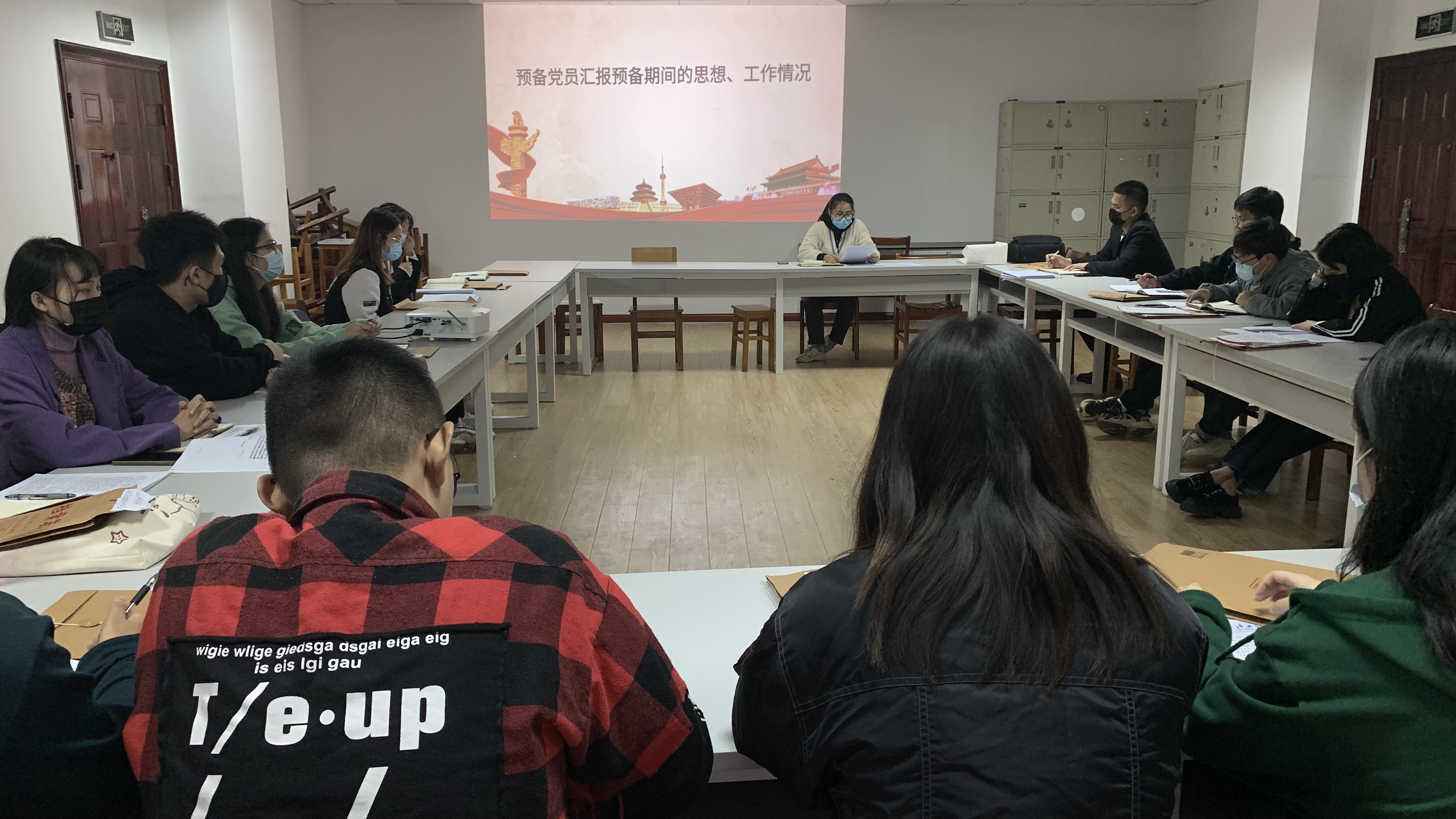 预备党员自我情况说明完毕后,进行大会第三项学生预备党员互评,学生预备党员相互进行点评,然后由姚存老师作为教师代表同意21位预备党员正式纳入中共党员行列中来。