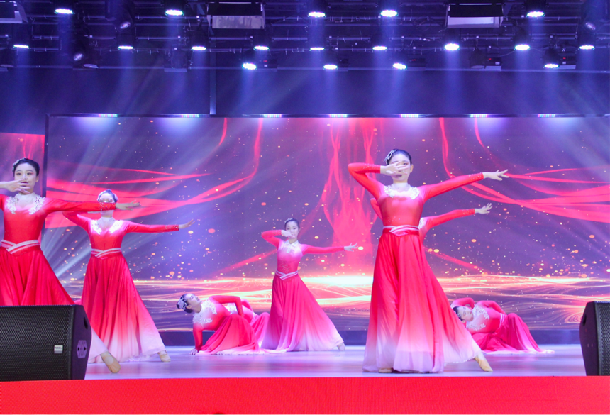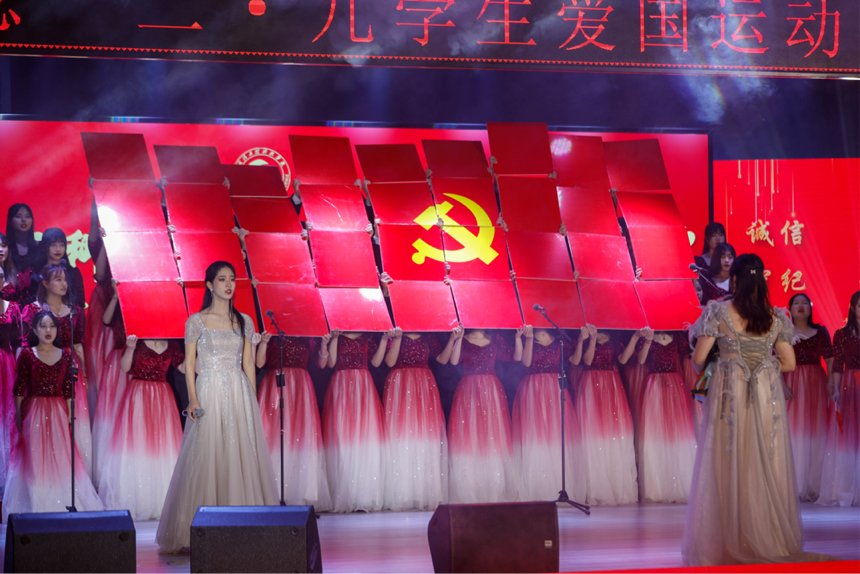 纪念一二.九学生爱国运动文艺晚会以一曲女子群舞《盛开》开始,这首充满红色韵味的舞蹈,瞬间将同学们带到一个“红色氛围”之中。