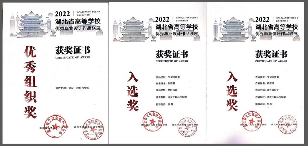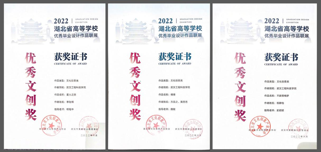 湖北省40余所本科院校积极参与,优中选优推出作品300余套报送展览组委会,通过专家评审,武汉大学、华中科技大学、武汉理工大学、中国地质大学(武汉)、湖北美术学院、武汉工程科技学院等30余所院校共81套作品获得优秀文创奖、83套作品获得入选奖。此次联展作品中我校师生共获优秀文创作品3项,入选奖2奖,优秀指导教师奖3项,武汉工程科技学院获得了本次联展的最佳组织奖。其中我校方奕之、黄思思同学的作品《傩缘》(指导老师:魏敏)、李贻祺同学的作品《星火之旅》(指导老师:杨程中)和祝静怡同学的作品《不辞黄梅梦》(指导老师:史颖颖)获得优秀文创作品奖。杨淑晴的作品《武当音乐节》(指导老师:吴玥)和张春霞的作品《知音号》(指导老师:李晶)获入选奖,魏敏、杨程中、史颖颖三位老师分别获优秀指导教师奖。